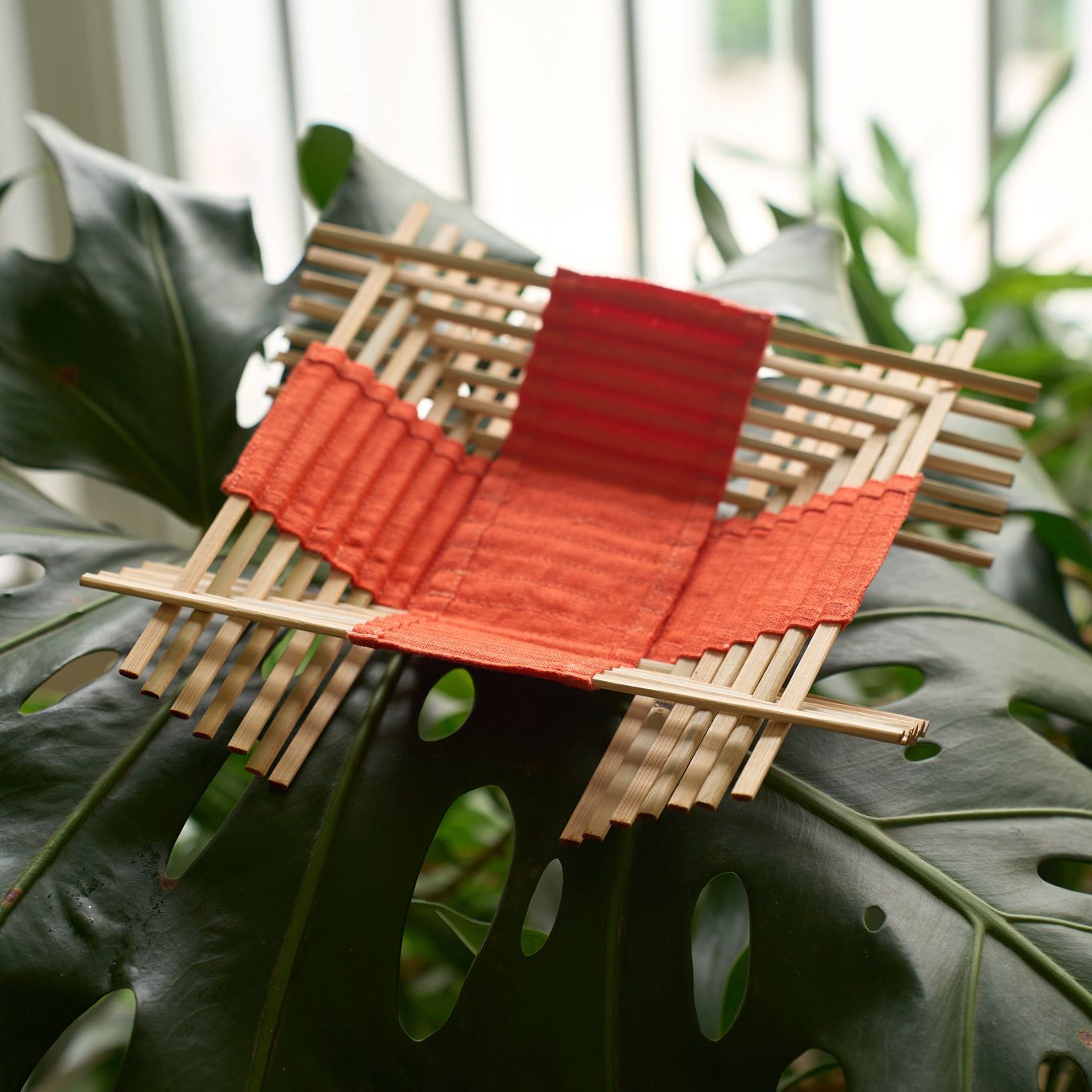 Weaving by assembly, hand-finished stitching