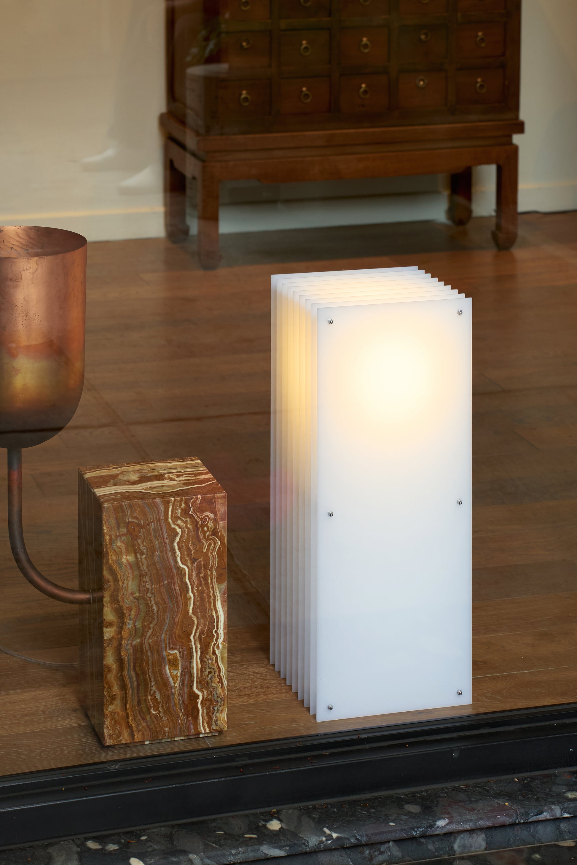 Materials: acrylic, stainless steel, matte opal glass